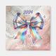 This delightful holiday magnet showcases a light-reflective iridescent bow arrayed against a milky way background, with the year highlighted in an elegant purple font. It is further adorned with several iridescent teardrops, adding to its allure. This chic, bow-themed magnet is designed to bring a refined touch to your decor. It can be personalized for any year.