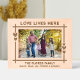 Show that love lives in your home with this personalized picture frame with custom text and cute hearts, perfect for a happy family. Personalize with charming picture frame with your family name and the names of each family member in a rough-hewn font etched into the wood. Also perfect for wedding photos!