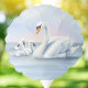 This charming swan scene with a mama swan with her little ones under a peachy sunset evokes innocent sweetness.