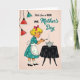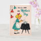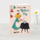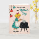 This design shows a young girl with bright eyes and rosy cheeks, her golden hair tied with a pink bow, standing as if she’s preparing something for someone she cares about ❤️. She wears a teal dress with small light-blue flower shapes and a white ruffled apron tied in back, giving her a tidy, homey look. In her hands, a spoon hovers over a lidded bowl, and thin curls of steam rise as though a warm treat is about to be shared. The background is a soft peach tone that keeps the scene gentle and cozy, like a quiet kitchen moment between friends or family. Beside her sits a small round table covered in a dark cloth decorated with gray swirl patterns, adding a decorative touch without stealing attention. The main greeting text is placed near the top in a darker shade that stands out against the peach, with smaller supporting words tucked below in a matching tone 🌼. Above the girl hang three lamps—two deep red and one teal—spaced evenly across the upper area.