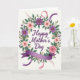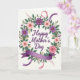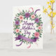 Designed with a circular wreath of flowers and greenery at the center, this card frames a gentle Mother’s Day message with loving care ❤️. The words “Happy Mother’s Day” sit in the middle in purple lettering, standing out against a soft cream background. Around the text, green leaves form a lush ring that feels like an embrace, as if the blooms are leaning inward to protect what’s being said. Deep plum flowers with small golden centers mix with pale pink blossoms, creating a sweet contrast that suggests both strength and tenderness 🌼. Some flowers look full and rounded like garden roses, while others open more lightly, with tiny golden sprigs and small violet accents tucked between. A thin, curved band with a muted rainbow-like look is woven subtly into the wreath, adding a quiet celebratory touch. Lavender and rosy ribbons curl through the arrangement, and a wide purple banner anchors the bottom while a soft pink ribbon streams from the upper right.