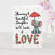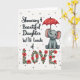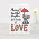 This card shows a cartoon baby elephant in gentle gray with soft pink inside its ears and along its trunk, seated on the right with a tender, affectionate gaze. Its trunk curls around a bright red umbrella patterned with tiny white flowers, like it’s sheltering someone close with quiet care ❤️. The background is white with small, light-gray polka dots scattered like a soft drizzle, adding texture without crowding the scene. On the left side, black flowing lettering runs vertically in a neat stack, leaving airy space between the lines. Near the bottom, the word “LOVE” stretches wide across the page in large letters built from red blossoms and deep green leaves. The floral letters feel like a bouquet arranged into typography, giving the design a gentle romance and a friendly warmth 🌼. The red umbrella tilts slightly upward, echoing the curve of the elephant’s trunk while the dotted “rain” drifts around it. The lower edge is visually anchored by those petal-filled letters, with green foliage peeking between the reds.