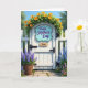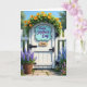 This card features a garden gate centered like a welcoming entrance, framed by a white picket fence with dark metal hinges and latch. An arch of leafy green garland stretches over the top, dotted with small star-shaped orange flowers that feel like a gentle bouquet offered with ❤️. Hanging at the middle is a scalloped turquoise sign with “Happy Mother’s Day” written in violet lettering, placed to be the first thing you notice. Just beneath it, a smaller golden plaque reads “Friend” in neat, darker lettering, adding a friendly, inclusive touch 🌼. Bright daylight washes the scene, leaving soft shadows that show the smooth paint on the fence and the textured weave of a wicker basket on the left. The basket spills purple-blue, spike-like flowers that echo matching clusters growing in the garden bed on the right, as if the blooms are leaning toward each other in quiet companionship. A path of natural stepping stones runs through vivid green grass and leads straight to the gate under a clear blue sky.