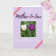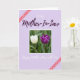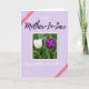 This card features a centered photo panel showing two spring flowers facing each other as if sharing a quiet, affectionate moment ❤️. The left bloom is creamy white with softly lit petals, while the right bloom is deep purple with a velvety look, both rising on slender green stems. Behind them, blurred green foliage creates a calm garden setting that makes the pair stand out. The surrounding background is pale lavender, echoing the purple flower and keeping the mood gentle and warm. Above the photo, the phrase “to my Mother-In-Law” appears in a flowing handwritten-style font, mixing white and deeper purple lettering. Below the photo, “Happy Mother’s Day with Love” is written in white in the same flowing style, and a small 🌼 fits naturally with the floral theme. Two diagonal reddish-pink ribbon strips with white polka dots sit in opposite corners, adding a cheerful frame-like touch.