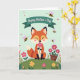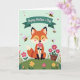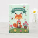 Designed with a soft, storybook-style illustration, this card features a fox-like woodland animal with russet fur, black-tipped ears, and a creamy muzzle sitting on a gently rolling green hill. Its eyes are closed as it lifts a bright pink daisy to its nose, and the calm pose suggests a tender, affectionate moment ❤️. The sky is a light mint green, and small pink heart shapes drift around the character like quiet signs of closeness. A few tiny striped insects with delicate pink wings float nearby, adding light motion without distracting from the gentle scene. Across the top, a teal ribbon banner stretches horizontally, and the message appears centered on it in white, flowing lettering. The grassy hill is dotted with simple flowers in pink, yellow, and deep maroon, creating a cozy garden feel 🌼. Near the lower area, a rustic brown pot holds extra blooms beside the scattered blossoms on the hill.