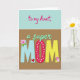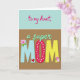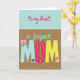 Designed with a bright, graphic layout, this card splits the design into two horizontal sections that feel like a cheerful note passed between close hearts ❤️. The top band is a soft light aqua, where a friendly greeting sits near the center in fuchsia, written in a loose, hand-drawn style that feels like it came from someone who knows you well. Below it, a warm earthy brown area holds the main message, starting with a gentle seafoam-green line of text placed above the big focus word. The word “MOM” appears in large, raised-looking letters across the lower section, each letter decorated with small dots and sweet little accents. The first “M” is sky blue with a tiny pink flower detail and a small red heart tucked in, like a quiet sign of affection. The “O” is a rich magenta, and the final “M” is sunny yellow with two soft pink blossoms that add a friendly, caring touch 🌼. The colors stay crisp and cheerful, with the aqua top and brown bottom framing the multicolored “MOM” lettering.