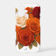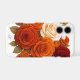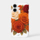 A stunning floral case showcasing rich autumn roses in shades of orange, red, and cream, arranged in a warm and elegant bouquet with a personalized monogram, classic and romantic.