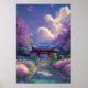 This digital artwork captures the beauty of a traditional Japanese shrine surrounded by lush pink bushes and cherry blossom trees. The cloudy sky adds a touch of mystery and enchantment to the scene, making it feel like a serene and calming oasis. This piece is perfect for anyone looking to add a touch of elegance and tranquility to their space.