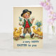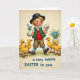 This design shows a fair-haired child with rosy cheeks and bright blue eyes under a dark, wide-brimmed hat, stepping forward as if heading to meet a friend. They wear a white shirt with a red waistcoat, a green jacket, beige shorts, and blue stockings, and the neat outfit makes the scene feel like an old-fashioned spring stroll 🌷. One hand cradles two smooth, pale egg-shaped objects close to the chest, while the other steadies a small vase of tiny blue flowers, held like a gentle offering. At the child’s feet, five fluffy yellow ducklings waddle in a tight little line, their orange beaks angled up as if watching the child with trust 🐇. The background is a soft, aged cream tone like worn paper, with faint green strokes below suggesting a grassy path. A short Easter greeting sits near the top in dark ink, centered above the figures, and two small vases of blue flowers appear near the upper corners to frame the scene. The ducklings’ bright yellow down contrasts with the calm blues of the flowers and stockings against the creamy backdrop.