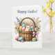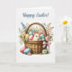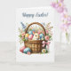 Celebrate the joy of Easter with this beautifully illustrated card featuring a vintage-style watercolor Easter basket overflowing with colorful eggs, soft spring flowers, and an adorable bunny peeking out. Painted in delicate pastel hues, this design evokes the nostalgic warmth of springtime and Easter traditions.