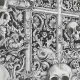 Express your Goth aesthetic or decorate for Halloween with this black and white design inspired by the charnel houses of Gothic cathedrals. White skulls jut from stone niches carved with vines.