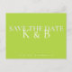 Chartreuse simple monogram save the date. Postcard. Two tones of text.