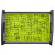 This modern serving tray features an abstract pattern on a chartreuse background.