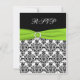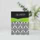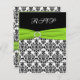 This black and white damask rsvp card with a lime green PRINTED ribbon and jewelled brooch matches the wedding invitation shown below. If you require any other matching items, or would like it in another color combination, please email niteowlstudio@gmail.com with your request.