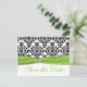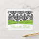 This black and white damask save the date postcard with a chartreuse green FAUX ribbon and jewelled brooch matches the wedding invitation shown below. If you require any additional matching items, please email niteowlstudio@gmail.com with your request.