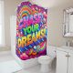 This colorful shower curtain says "Chase Your Dreams" on it.