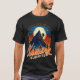 This t-shirt logo features a bold and adventurous design centered around the theme of mountain climbing and exploration. At the heart of the artwork, a climber is shown scaling a steep, jagged peak under the glow of a bright, radiant moon surrounded by twinkling stars. The mountain is framed by tall pine trees in warm hues of red and orange, contrasting beautifully with the cool blues of the rock face.