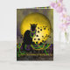 A silhouette of Théophile Steinlen's black cat for the Le Chat Noir club in a modern setting for Mardi gras with a bright yellow moon, lots of beads, and the words "Laissez les bon temps rouler," which means "Let the good times roll."
