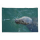 A grey seal swims gracefully through the calm sea water, its head clearly breaking the surface. Ripples spread outward, creating gentle patterns around it. Close in photo taken at Chatham Fish Market, famous for fresh seafood and photos of seals at the docks. Chatham, MA