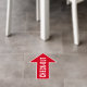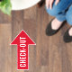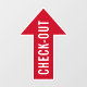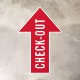 Red directional arrow with "check-out" in simple white typography. You can customize as desired, e.g., "Exit," "Restrooms," "Elevators," etc. You can also change the colors of the background and text to your company's branded colors by editing in the design tool. The default measurements are approximately just under 14 inches long and 8 inches at the widest part of the arrow. You can change the size on the product page if needed.
