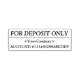 This traditional rubber stamp design features the message "FOR DEPOSIT ONLY", plus a personalized personal/business name and account number. It might perhaps be used by an office clerical worker, a small business operator or an individual to quickly add a restrictive indorsement to a cheque.