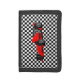 Great looking black tri fold wallet with graphics of a black and white checkered pattern, on the front flap. Cool graphics of a red formula race car decorates the checkered background. Customize to add text. Makes a great gift idea.