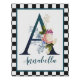 Beautiful and fancy florals include gold leaves, purple rose and blue wildflowers embellishments on large letter / initial A with a black and white checkerboard border