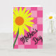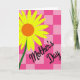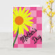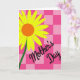 This card features a large cheerful flower filling the left side, with long yellow petals fanning out from a round orange center like a sunny hello ❤️. A slim deep-green stem drops downward, giving the bloom a graceful, steady posture that feels like a caring hand reaching in. Behind it, the background is a checkerboard of bright fuchsia and soft pink squares, each corner slightly rounded for a gentler look. The strong color contrast creates a lively scene where warmth and closeness feel built into the layout, like a friendly hug in graphic form. Across the lower right, a flowing black message sits on a diagonal, standing out clearly against the pink squares 🌼. The lettering is placed low and right-weighted, balancing the big flower on the left without crowding it. Flat areas of color and crisp edges keep everything simple and graphic, with the flower’s orange center and the black text acting as the main focal points. The lower-right diagonal line of black text cuts across alternating fuchsia and pink squares with softly rounded corners.