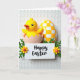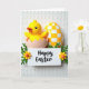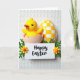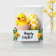 This design shows a small yellow chick-like bird peeking out of a pale cracked eggshell, its orange beak and dark eyes giving it a sweet, friendly look 🐣. Just behind it stands a taller egg shape covered in a yellow-and-white checker pattern that feels like a cheerful backdrop. In front, a white rectangular sign sits low in the scene, with a short greeting written in flowing black lettering centered on the plaque. Tiny green sprigs lean in from both sides of the words, like they’re gently framing the message for someone special 🌷. Petite yellow flowers with orange centers dot the greenery, adding a soft touch that suggests care and closeness. The light is diffused and gentle, making the yellows look warm while keeping the whites creamy rather than stark. The background is an off-white surface with repeating raised oval textures that sit quietly behind the brighter shapes.