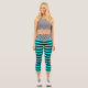 Leggings waistband is black and white checkerboard and below are striped black with aqua.