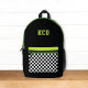 This fun kids backpack design features a black, white, acid green, and olive green color palette with checkered pocket and initials. It's a fun modern design for all ages!