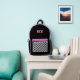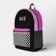 This fun kids backpack design features a black, white, pink, and magenta color palette with checkered pocket and initials. It's a fun modern design for all ages!