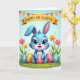 This card features a cute, baby-like bunny in soft blue with pink inner ears and rosy cheeks, sitting on a rich green patch of grass and hugging a pink checkered egg 🐰. Around it, several large decorated eggs in blue, orange, and pink are scattered like gifts, their geometric patterns adding a cozy party feel. The bunny’s wide eyes and gentle smile give it a sweet, friendly look, as if it’s sharing a quiet moment with someone just off to the side 🐇. In the foreground, bright pink and warm orange flowers sprout from the grass, framing the scene like a spring garden. Across the top, a gold banner stretches in a curved line with the words “Happy 1st Celebration” in a darker contrasting color for easy reading. Small triangular pennants hang nearby in matching tones, adding a festive touch without crowding the picture. The lighting is soft and even, giving the bunny and eggs a slightly glossy, rounded look. Behind everything, a pale blue background keeps the focus on the grassy mound, the patterned eggs, and the curling banner overhead.