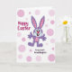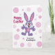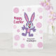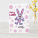 Designed with a sweet springtime look, this card features an upright, long-eared character in soft purples and cheerful pinks, standing front and center like it’s ready for a friendly hug 🐰. Its body has a checkered pattern that reads like cozy fabric, and its large eyes and wide grin give it an affectionate, welcoming expression. The outstretched arms add a gentle, close-to-you feeling, like a warm hello shared between friends or a couple. The background is bright white and sprinkled with light pink circles in different sizes, creating a light, airy setting 🌷. Across the top, a seasonal greeting appears in thick magenta lettering, arcing above the character’s ears. Near the bottom, a short message sits beneath the figure in a smaller pink line, centered and easy to read. The long-eared character has a rosy nose, a toothy smile, and purple-and-pink checks framed by scattered pink dots on the white backdrop.