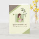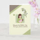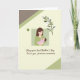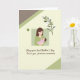 This card shows a gentle scene in muted greens and creamy beige, with warm touches that feel tender and close ❤️. At the center, a woman with dark hair and a calm face cradles an infant, her eyes softly closed as if savoring a quiet moment together. She wears a light green top, and her arms curve protectively around the baby in a way that suggests deep affection and trust. The infant, dressed in a pink-and-white checkered outfit, looks up with wide eyes and lifts a tiny hand toward her, creating a sweet, connected exchange. The illustration sits inside a pale green rectangular frame against the creamy background, keeping the focus intimate and calm. In the upper right, a slim botanical sprig reaches inward with dark green leaves and small white blossoms 🌼. Near the edges, soft brown and light green diagonal shapes and a small square add a modern touch without pulling attention away from the figures. Along the lower area, a neat line of darker green lettering reads, “May your first Mother’s Day leave you precious memories,” beneath the framed artwork.