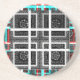 Checkered Pattern: The alternating red and cyan lines in the border, combined with the black and white squares in the center, create a visually engaging checkered motif. The repetition and layering add to the complexity.