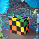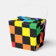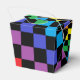 Abstract digital art of black and rainbow colored squares in a checkered formation.