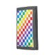 Abstract digital art of white and rainbow colored squares in a checkered formation.