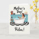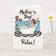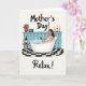 Designed with a soothing bath-time scene, this card shows a woman reclining in a bubble-filled tub, her relaxed gaze and gentle posture suggesting a quiet, cared-for moment ❤️. She holds a clear glass of deep red drink, and the white foam curls around her shoulders for a soft contrast against her skin. Behind her, light blue square tiles set a calm backdrop, with a slim shelf running across the wall. On the shelf sits an earthy red vase packed with mixed flowers 🌼, a small retro-style radio, and three lit candles in red holders that add a warm glow. A small round wooden side table near the tub holds a matching bottle of red drink and a second empty glass, hinting at shared company without showing anyone else. The text “Mother’s Day!” appears at the top in dark lettering, while “Relax!” is placed along the bottom in matching dark text. Beneath everything, a black-and-white checkered floor pattern grounds the scene with crisp squares.