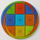 The central portion features a grid or checkerboard pattern composed of squares in red, golden yellow, green, and cyan.