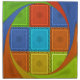 The central portion features a grid or checkerboard pattern composed of squares in red, golden yellow, green, and cyan.
