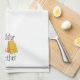 This funny cheese pun kitchen towel features the play on words phrase "cheddar together" with two kawaii style cheddar cheese wedges holding hands.