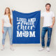 Fleece blanket is shown in a color of royal blue with a white cheer mom pom print.