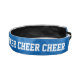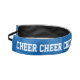 Non slip wide headband shown in royal blue and black satin with white cheer text.