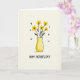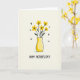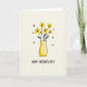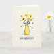 This card features a cheerful digital illustration of sunny yellow flowers gathered closely together, like a small bouquet offered with a tender, friendly gesture ❤️. Each blossom has a simple five-petal shape with a dark center, standing out against a softly textured, creamy off-white background. Dark, slender stems rise from a rounded golden-yellow vase, with a few small green leaves adding gentle contrast. The vase shows light shading that gives it a soft, rounded dimension, as if it’s catching warm daylight. Near the top half of the design, small black chevron-like marks are scattered, suggesting a light flutter in the air 🌼. Beneath the illustration, a hand-lettered message sits centered near the bottom in black text, leaving comfortable space around it for an easy-to-read look. A faint shadow rests under the vase, grounding it on the pale surface.