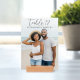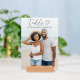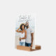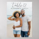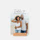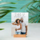 This wedding table card features a serene beach scene with two individuals standing close together, smiling against the backdrop of gentle ocean waves and a clear sky. The design uses a soft color palette of light blues and sandy beiges to create a relaxed and joyful atmosphere, perfect for a seaside celebration. Elegant cursive typography at the top reads "table 12," while the names are presented in clean, uppercase sans-serif font below, adding a touch of sophistication. The overall layout is spacious and airy, emphasizing openness and leisure, making it an ideal choice for couples looking to capture their special day in a picturesque setting.