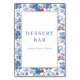 This elegant wedding tabletop sign features a symmetrical layout with a central white space surrounded by a charming floral border in shades of blue and red. The design showcases detailed botanical illustrations, reminiscent of classic porcelain patterns, creating an inviting and cheerful atmosphere. The text "DESSERT BAR" is prominently displayed in a serif font, encouraging guests to indulge in sweet treats. Perfect for adding a touch of sophistication to your event, this sign combines traditional style with a playful mood, making it ideal for celebrations where a welcoming vibe is key.