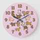 Beautiful lavender wall clock for dog lovers. This fun home accent is decorated with various whimsical cartoon illustrations of dogs. The design includes big bold numerals for each hour. Great housewarming gift for a dog loving family or a dog owner.