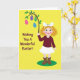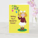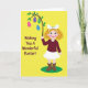 This greeting card shows a young cartoon-style girl with tightly curled auburn hair and a large white bow, smiling with bright blue eyes and rosy cheeks as if she’s sharing a sweet moment with the viewer 🐰. She wears a maroon long-sleeved top, a white skirt with a small ruffle, and brown boots, standing on a small green oval patch like a tiny lawn. In one raised hand, she lifts a thin, curved branch with fresh green leaves, held with a gentle, giving gesture that feels like friendly affection. Hanging from the branch are four egg-shaped decorations in fuchsia, lavender, emerald, and blue, each covered in patterns such as cross-hatching, dots, and plaid. The background is a strong sunny yellow that makes the figures and eggs stand out like a spring display 🌷. On the left side, a short Easter greeting appears in a rounded font, set in a warm orange tone and spaced neatly to balance the artwork. The eggs dangle in a tidy row from the leafy branch, each one attached by a small loop and string.
