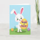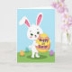 This card shows a friendly white bunny-like character centered on a sky-blue background, standing on a grassy green strip with a tender, welcoming look in its emerald eyes 🐰. Its long ears have soft pink inner details, and faint rosy cheeks add a gentle, affectionate touch. The character hugs a large sunny yellow oval decorated with wide tangerine and lavender bands, held close like a cherished gift. Across the middle of that oval, milestone words are written in purple lettering, stretching horizontally so they’re easy to spot. Around the character’s feet sit several smaller decorated ovals, including a teal one with white dots, an orange one with detailed patterning, and a deep purple one that adds contrast 🌷. The simple, flat illustration style keeps edges smooth and colors crisp without heavy shading. The scene stays uncluttered, with the bunny centered while the patterned ovals form a loose semicircle along the green ground. The purple text sits directly on the large yellow oval, framed by the tangerine and lavender stripes.
